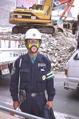 5月29日、神戸市三宮周辺の解体現場をまわって、オーストラリアから送られてきた労働者用防塵マスクを配布した。手ぬぐいで口を押さえながらアパートを解体していた作業員や、解体現場の警備員の方々は喜んで防塵マスクを受け取った。