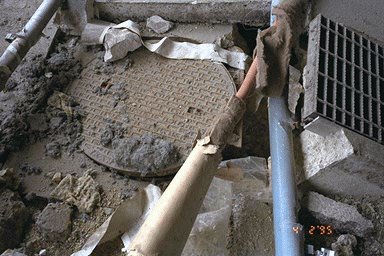 神戸市中央卸売市場東部市場(東灘区深江浜町)の市場棟の梁は青石綿が吹きつけられていた。地震でこわれた梁を補強するときにはがした青石綿の塊が床に散乱していた(写真2)。
