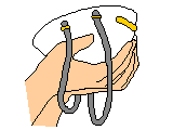 片手でマスクをしっか りと押さえながら、あ ごを包むようにかぶせ、 ゴムバンドを首回りと 頭部につけます。 |